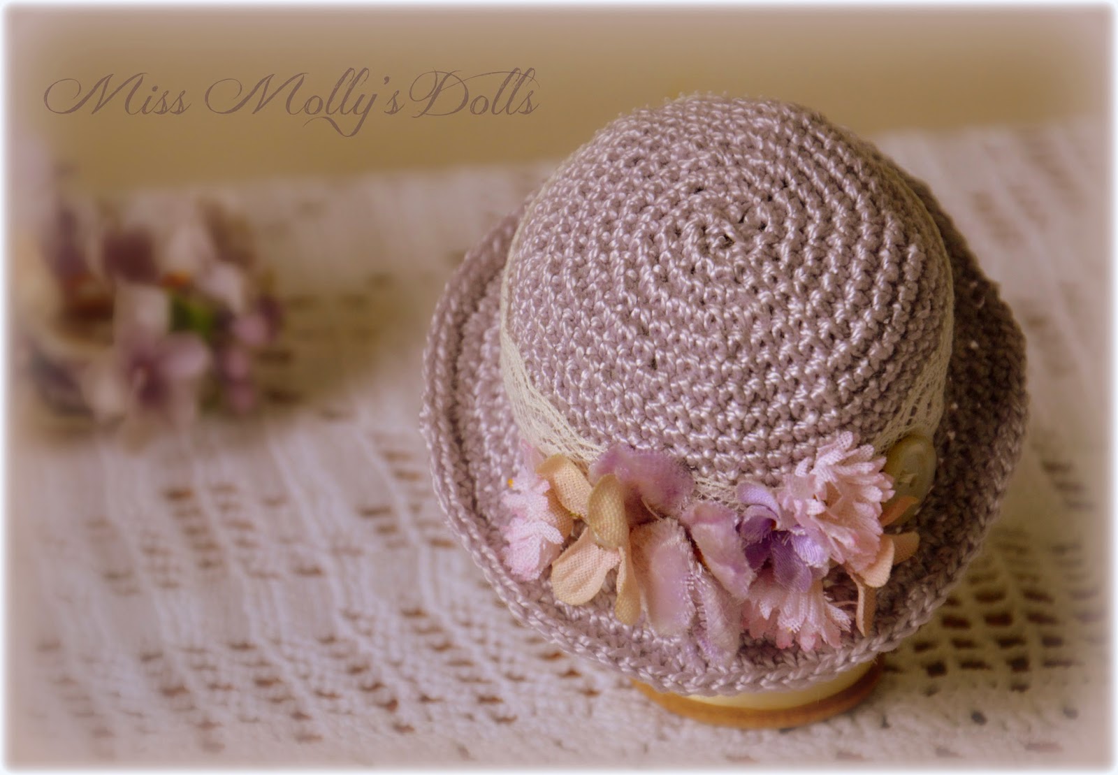 Here is a close up of Miss Agatha's hat, truly vintage, made from vintage crochet cotton and finished with antique flowers. lace and a little antique mother of pearl button.